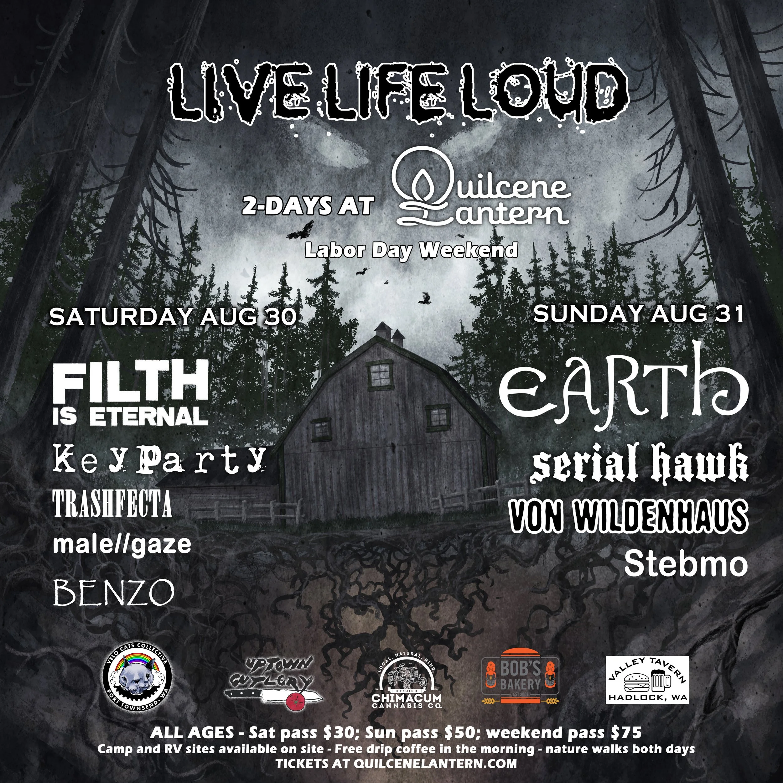 Live Life Loud presents two days of music at Quilcene Lantern, featuring legendary PNW act: Earth. Join us for two days of punk, metal, psychedelic rock and more during the Labor Day Holiday Weekend! Revel in farmland, towering forests, and a one-of-a-kind 90 year-old barn venue while listening to the incredible talent of the Olympic Peninsula region and beyond.